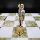 Поле шахмат выполнено из редкого и благородного оникса, сочетающего в себе оттенки белого и глубокого зеленого. Доска и фигуры, отлитые из бронзы, вручную расписаны серебром и золотом, придавая им неповторимый блеск и роскошь. Каждый элемент выполнен с исключительным вниманием к деталям, что делает эти шахматы настоящим шедевром.