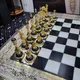 Корпус "Баталии" изготовлен из массива бука, усиленного мраморными вставками и лакированным долеритом. Декоративные элементы выполнены из полированной латуни, покрытой никелем и золотом, что придает набору блеск и элегантность. Внутри лабиринтного узора раскинулись шахматные фигуры, созданные с невероятным вниманием к деталям.
